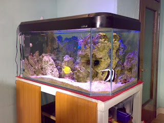 La solita sabbia presa alla coop per canarini (graniglia di marmo finissima e bianchissima) 2/3 cm e pieno di acqua salata. Dopo diverse letture qua e la nel web mi rendo conto che la cosa probabilmente più importante nell'acquario di barriera sono le rocce vive. Caspita ma a 12/15 euro al chilo non è semplice riempire una vasca come quella! Mi armo di pazienza e ne compro 2 o 3 chili alla volta, settimana in settimana, fino a che la vasca mi sembra bella piena. Il filtro biologico di spugne, cannolicchi, carbone e piccolo schiumatoio a porosa economico preso su ebay. Nel frattempo l'acqua è maturata ed è pronta per ospitare i primi animali secondo il negoziante.